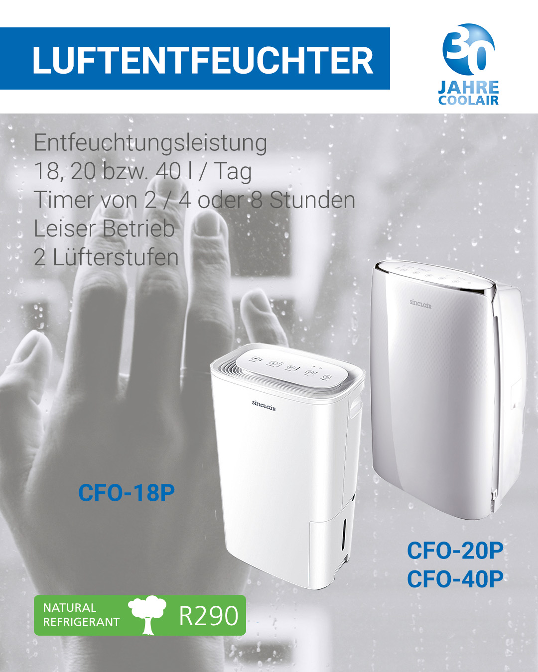 Unsere mobilen Luftentfeuchter der CFO-Serie von SINCLAIR sorgen für trockenes Raumklima - zuuverlässig, leise und effizient.
